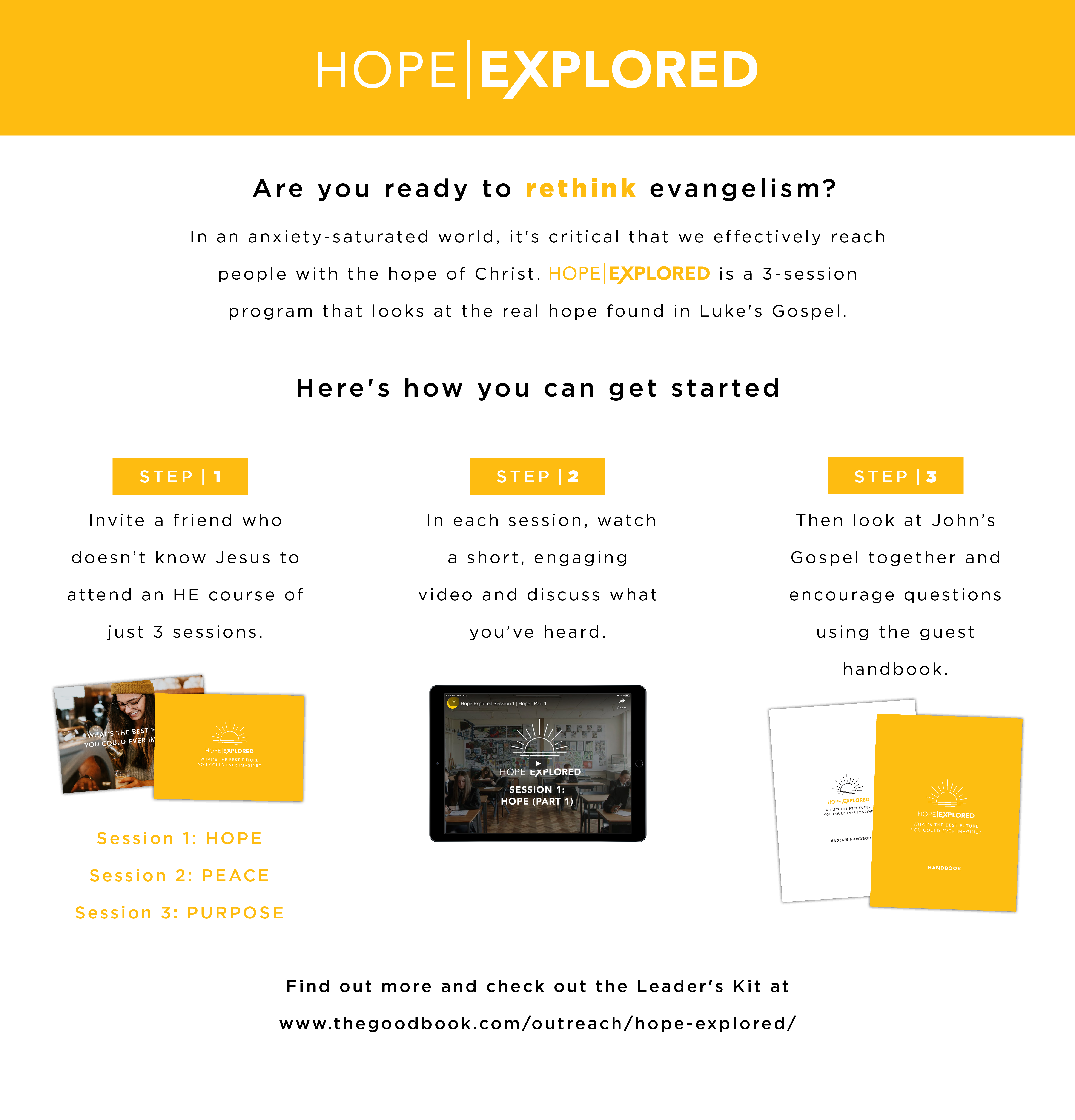 Check out the Leader's Kit, which contains everything you need to run this video-based evangelistic course: a Leader's Guide, a guest handbook, picture cards, a DVD and a code to access video downloads.