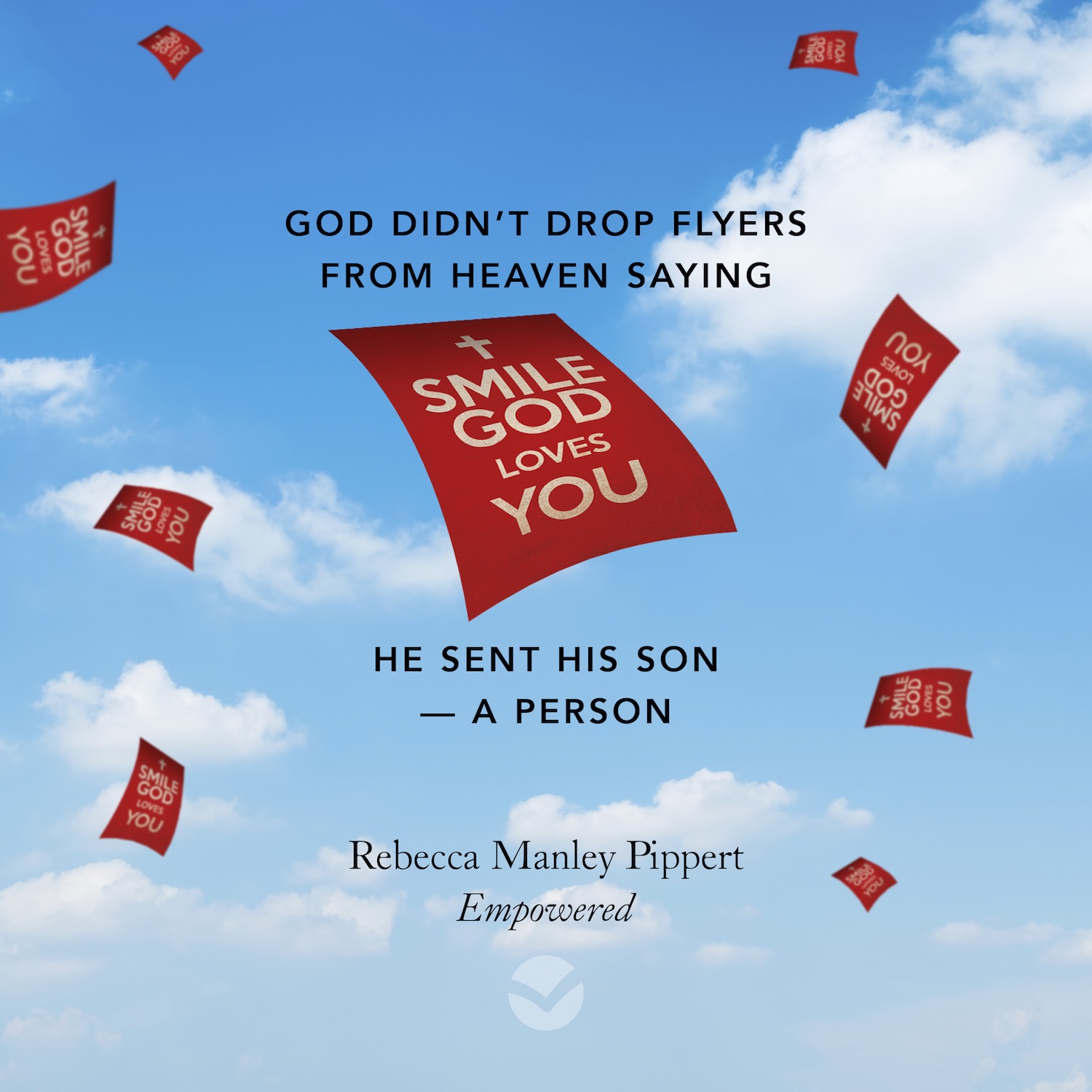 "God didn't drop flyers from heaven saying, 'Smile God loves you'. He sent his son – a person." (Rebecca Manley Pippert, Empowered)