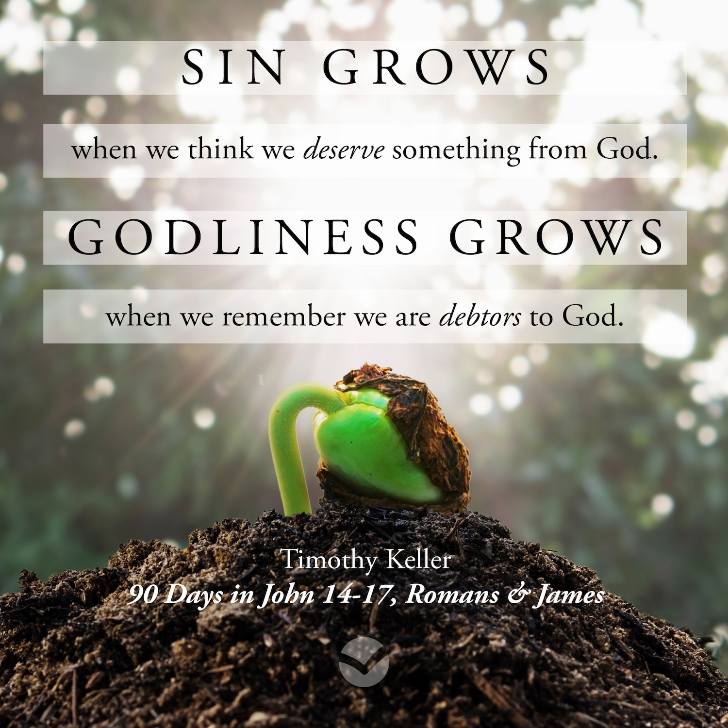 "Sin grows when we think we deserve something from God. Godliness grows when we remember we are debtors to God." (Tim Keller, 90 Days in John 14-17, Romans & James)