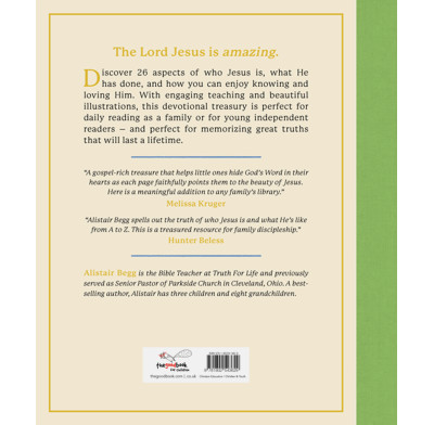 Jesus is incredible! This beautifully illustrated, fun-to-read book by beloved Bible teacher Alistair Begg gives kids a foundational theology of who Jesus is. Kids ages 5+ will grow in wonder of the Savior as they explore 26 aspects of his identity, organized from A-Z.