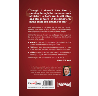 In 1 Kings For You, pastor and theologian Tim Chester helps readers follow the kingship of Israel. He covers David's death, Solomon's wise reign and the building of the temple, and the struggle between King Ahab and the prophet Elijah.