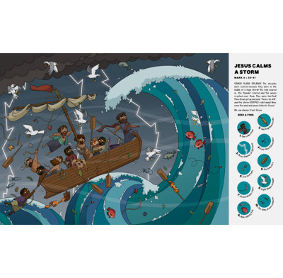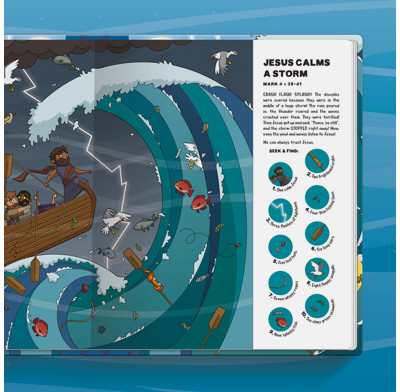 This beautifully illustrated "Seek and Find" book is packed full of all your favorite New Testament stories. It’s teeming with fun and exciting things to find—from faithful friends to scary Romans, and grumpy Pharisees to a frightened octopus!